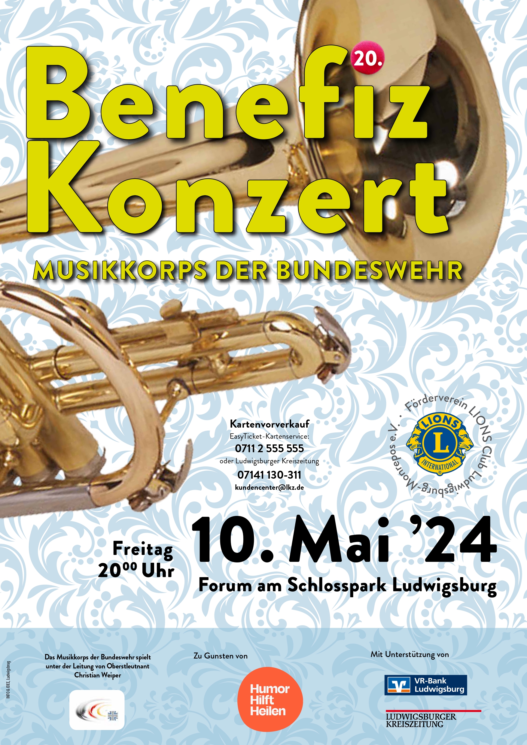 Am Freitag, 10.05.2024, um 20 Uhr, findet wieder das traditionelle Konzert des Lions Club Ludwigsburg-Monrepos mit dem „Musikkorps der Bundeswehr“ statt. Der Reinerlös kommt wieder HUMOR HILFT HEILEN zur Unterstützung der Klinikclownvisiten im Klinikum Ludwigsburg zugute.