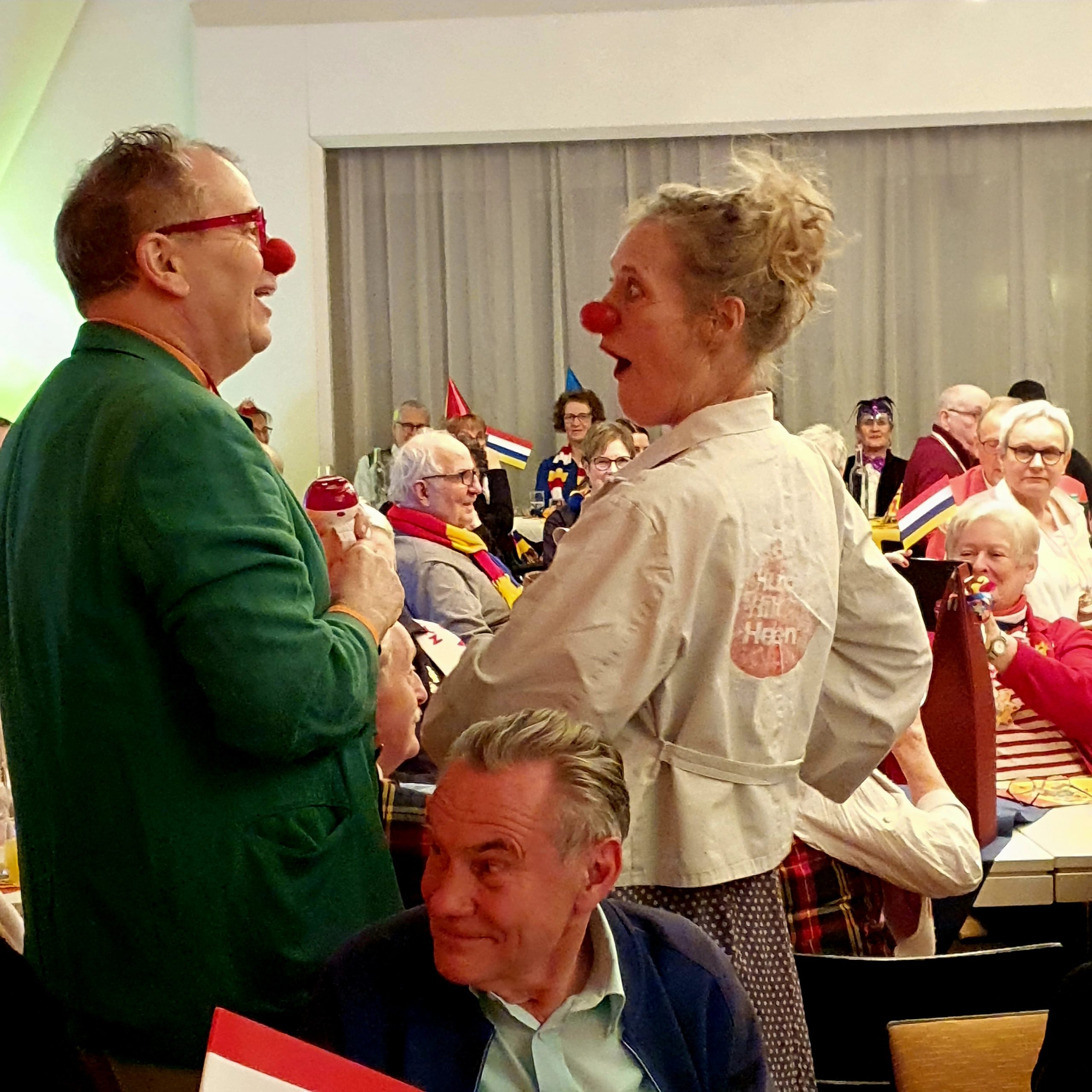 „Nach einer kurzen Pause mit Weck, Worscht und Woi und einer Selfiestation bei den Kostümen sollte der Abend weiter seinen Lauf nehmen: aber mitten in die Einführung platzten zwei Clowns mit Hupe und wirbelten den Saal durcheinander! Dr. Hupe und Kampino entpuppten sich als zwei Klinikclowns der Stiftung HUMOR HILFT HEILEN (begründet von Eckart von Hirschhausen) und im Gespräch mit der Moderatorin gaben Hanna Linde und Ludger Hoffkamp Einblicke in ihr Wirken in der Mainzer Uniklinik und andernorts. In der schweren Zeit im Krankenhaus, in der Krankheit alles bestimmt, wollen die Klinikclowns andere Themen ansprechen und eine positive Atmosphäre schaffen. Hanna Linde arbeitet mit Kindern und Jugendlichen und erzählte von einem neuen Projekt, Kinder vor und in den Operationssaal zu begleiten. „Wir schaffen helle Momente“, betonte Ludger Hoffkamp, der seine Erlebnisse mit Demenzkranken in der Geriatrie beschrieb. „Unser Kostüm, die rote Nase und auch die Musik spielen dabei eine große Rolle.“ Hoffkamp ist Diplom-Theologe und Pastoralreferent in der Diözese Rottenburg-Stuttgart: „Meine Ausbildung als Clown hilft mir auch in meiner pastoralen Arbeit, um den Menschen zu helfen, Leid und Trauer zu bewältigen.“ Eine solche Verbindung von Humor und Besinnlichkeit wünscht sich so mancher Redner der Fastnacht.