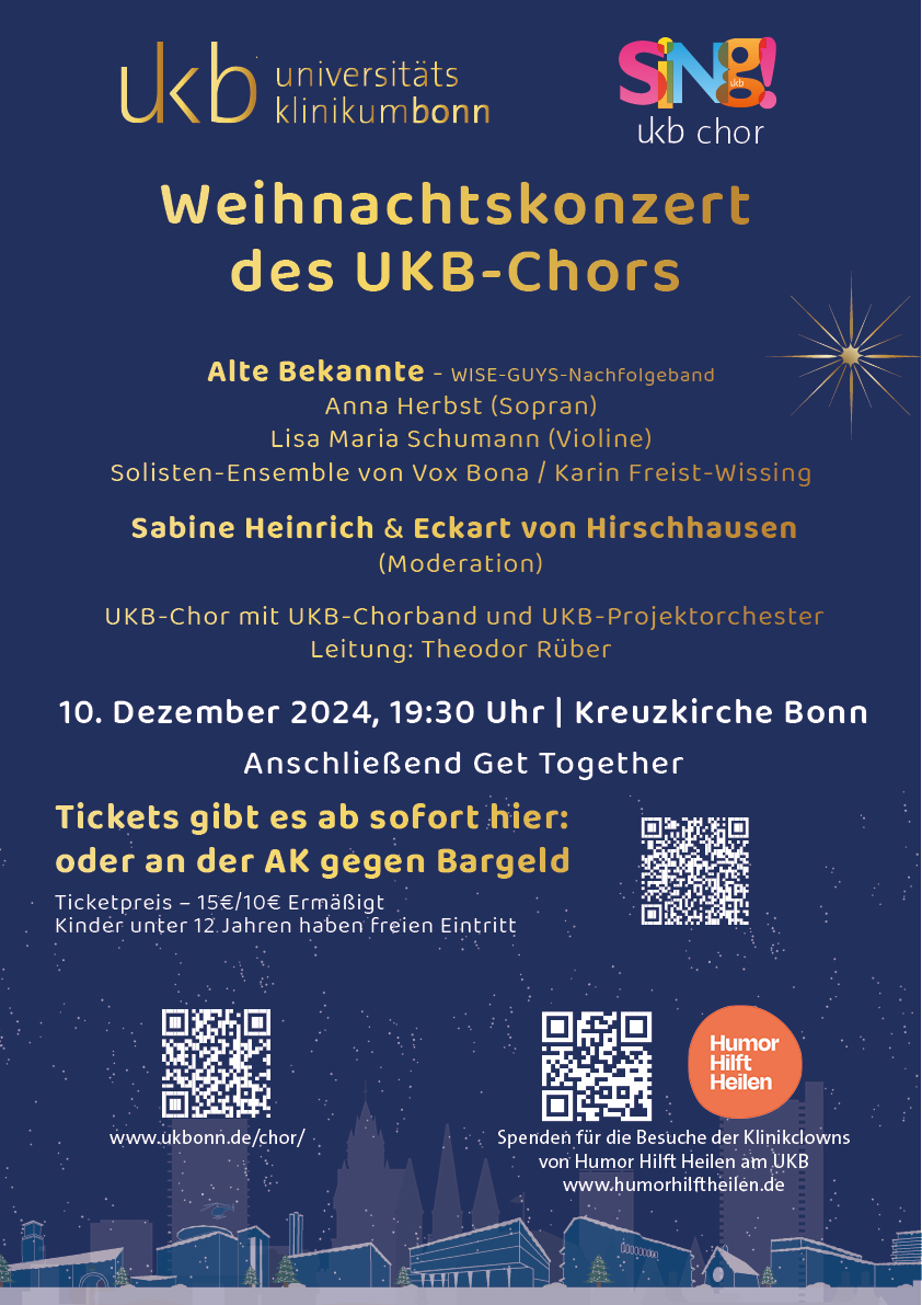 Neben dem Chor und seiner Band treten das UKB-Projektorchester sowie viele verschiedene Künstleri:nnen, u.a. die A Capella Band „Alte Bekannte“, auf. Moderiert wird das Konzert von Sabine Heinrich (WDR Moderatorin) und Dr. Eckart von Hirschhausen, Gründer und Geschäftsführer von HUMOR HILFT HEILEN. Im Anschluss wird zum Get-Together eingeladen.