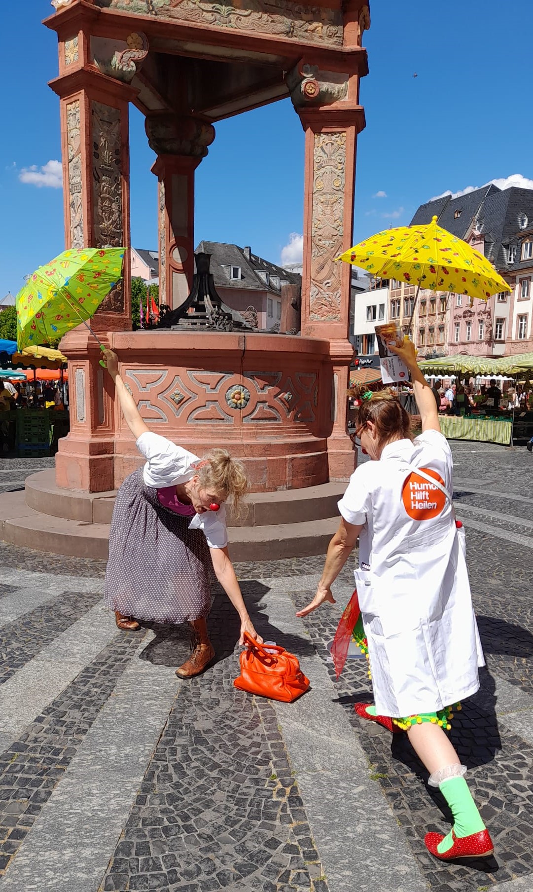 Live erleben konnten Bürger:innen sowie Besucher:innen der Mainzer Innenstadt ein Team der Klinikclowns der Stiftung Humor Hilft Heilen am Dienstag, 5. Juli 2022. Zu so genannten „Walkacts“ am Leichhof luden Hanna Linde, Künstlerische Leitung Klinikclowns bei Humor Hilft Heilen, und ihre Kollegin Annett Stein vor Ort ein, um auf ihre wertvolle Arbeit als professionell arbeitende Klinikclowns in verschiedenen Bereichen des Zentrums für Kinder- und Jugendmedizin der Universitätsmedizin Mainz aufmerksam zu machen.