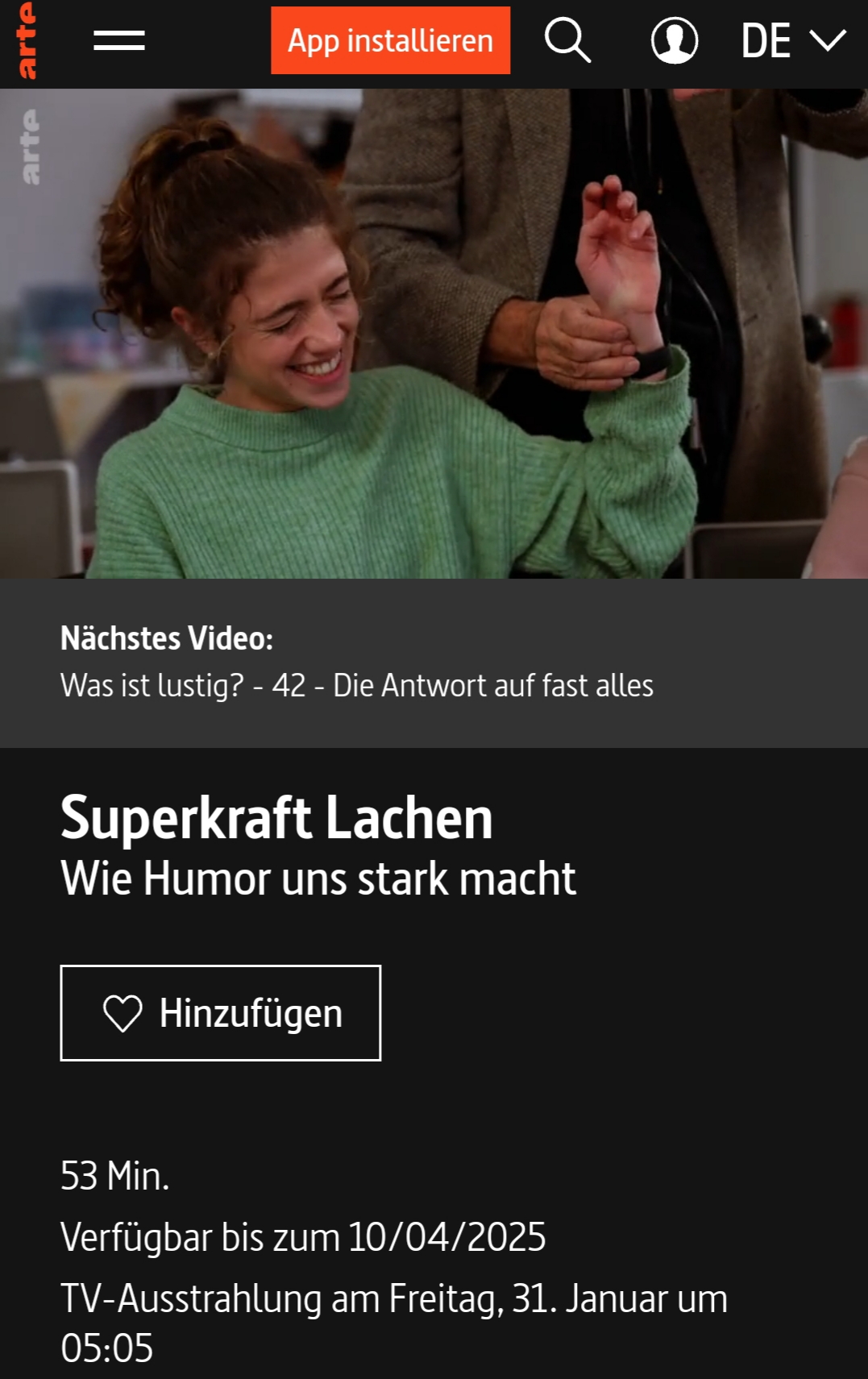 Wer Interesse an dem Film hat, der findet ihn hier: https://www.arte.tv/de/videos/114195-000-A/superkraft-lachen/